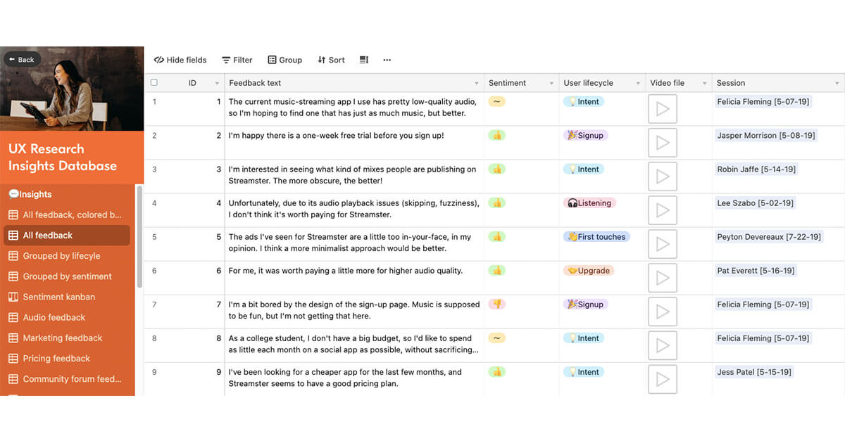 • Görüşme bulgularınızın belirlediğiniz bir formata uygun olarak Airtable’a girişini sağlayabilirsiniz. Format yapılandırmanızı çalışma sonunda ulaşmayı hedeflediğiniz çıktılara uygun bir şekilde en başta oluşturulmuş olması çıktı oluşturma sürecinizi kısaltıp değerlendirme sürecinize daha çok zaman ayırıp zenginleştirmenize imkan sağlayacaktır. Örneğin, bir affinity map çalışması yapılacak ve çıktı olarak personalar ve kullanıcı yolculuk haritaları oluşturacaksanız, buna uygun olarak affinity map başlıkları, personalar ve yolculuk adımları gibi üç ayrı tablo oluşturup bu tablolar için gerekli gördüğünüz formül, otomasyonlar ve uygulama kurulumlarını analiz öncesinde oluşturup siz verileri işledikçe işlenen verilerin anlık olarak raporlarınıza işlenmesini sağlayabilirsiniz. Burada anlatılanlara uygun başarılı örneklerden birisi olarak Airtable Universe içerisindeki UX Research Insights Database’i inceleyebilirsiniz.